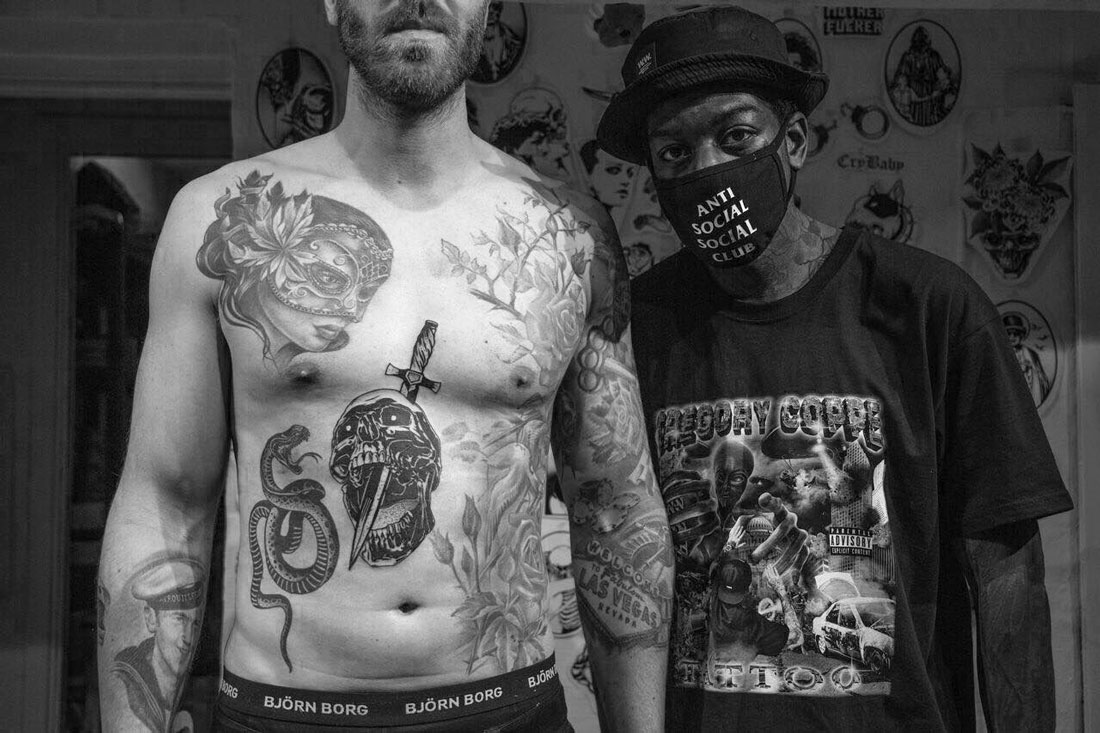 Mysta creates dark graphic tattoos with beautiful melancholy and explicit technique. His clean style is truly influenced by his former years as a fashion designer, working for luxury fashion houses as Balenciaga and Givenchy. Mysta used to live in Paris, but is now residented in Sinners Inc Aarhus.